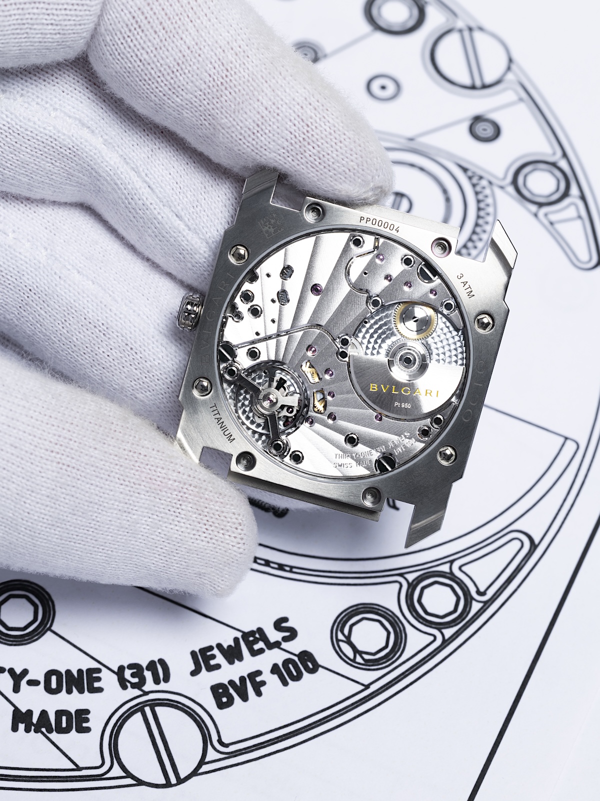 La disminución de tamaño de la caja del nuevo Octo Finissimo ha obligado la creación de un nuevo mecanismo para darle vida. Este nuevo movimiento es el Calibre BVF 100, que aunque comparte alguna similitud con el Calibre BVL 138 que equipa a los Finissimo de 40 mm, se trata de dos movimiento totalmente distintos. Contando con la ventaja de partir desde cero, Los ingenieros de Bvlgari han optimizado y adaptado todos sus componentes al nuevo tamaño. Su diámetro es 31 mm y su grosor de 2,35 m, lo que ikjmplica unna disminución del volumen en un 20%.