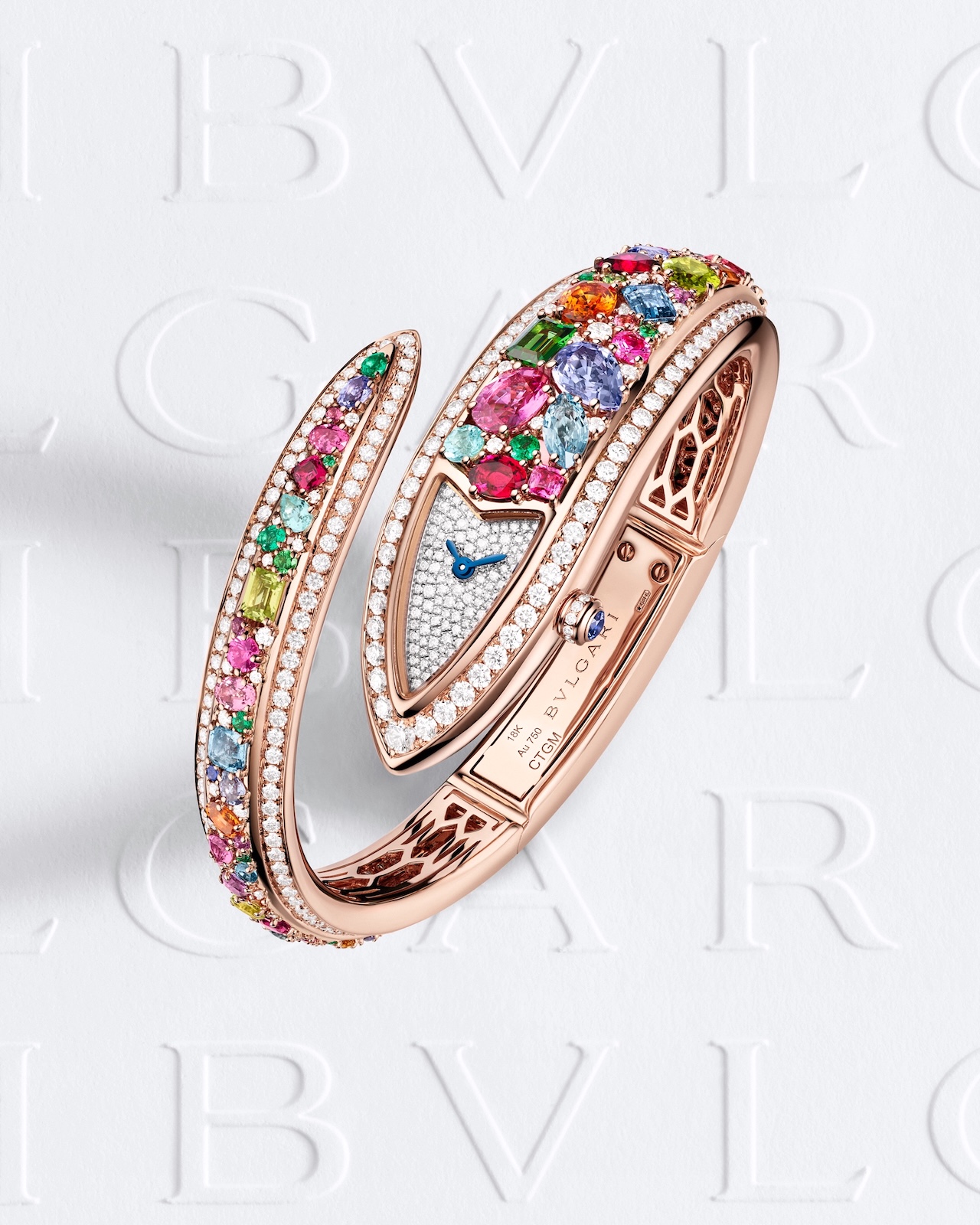 El segundo Serpenti Aeterna está realizado con oro rosa y opta sin disimulos por la máxima espectacularidad, hacciéndolo con un estilo policromo muy Bvlgari. En este caso tenemos todo el perímetro de la serpiente adornado con un engastado con diamantes talla brillante, que junto con los que adorna la esfera suman 493 piedras. El centro del cuerpo de la serpiente se engalana con multitud de gemas que abarcan la rubelita. la amatista, el topacio, la esmeralda, la citrina, el zafiro rosa, la tanzanita, la paralba, la tsavorita, la espersatita, la turmalina rosa, el aquamarina, el zafiro azul y el peridoto. En ambos relojes, el movimiento que equipan es de cuarzo.