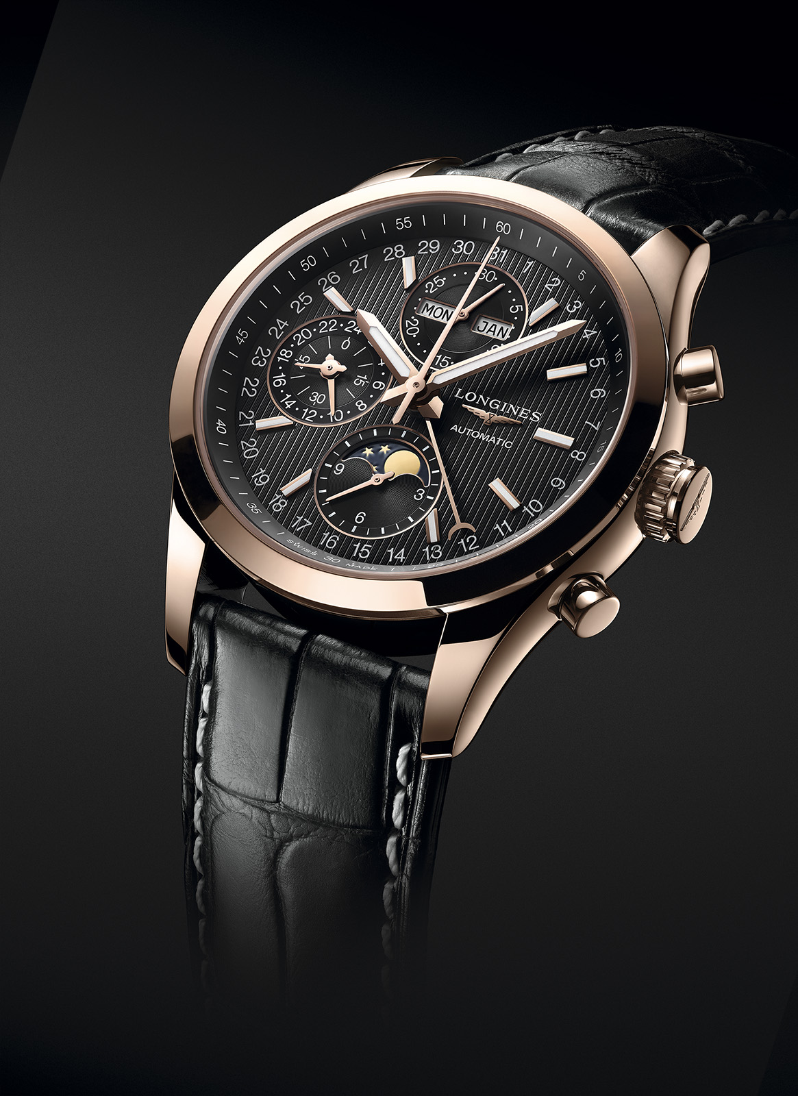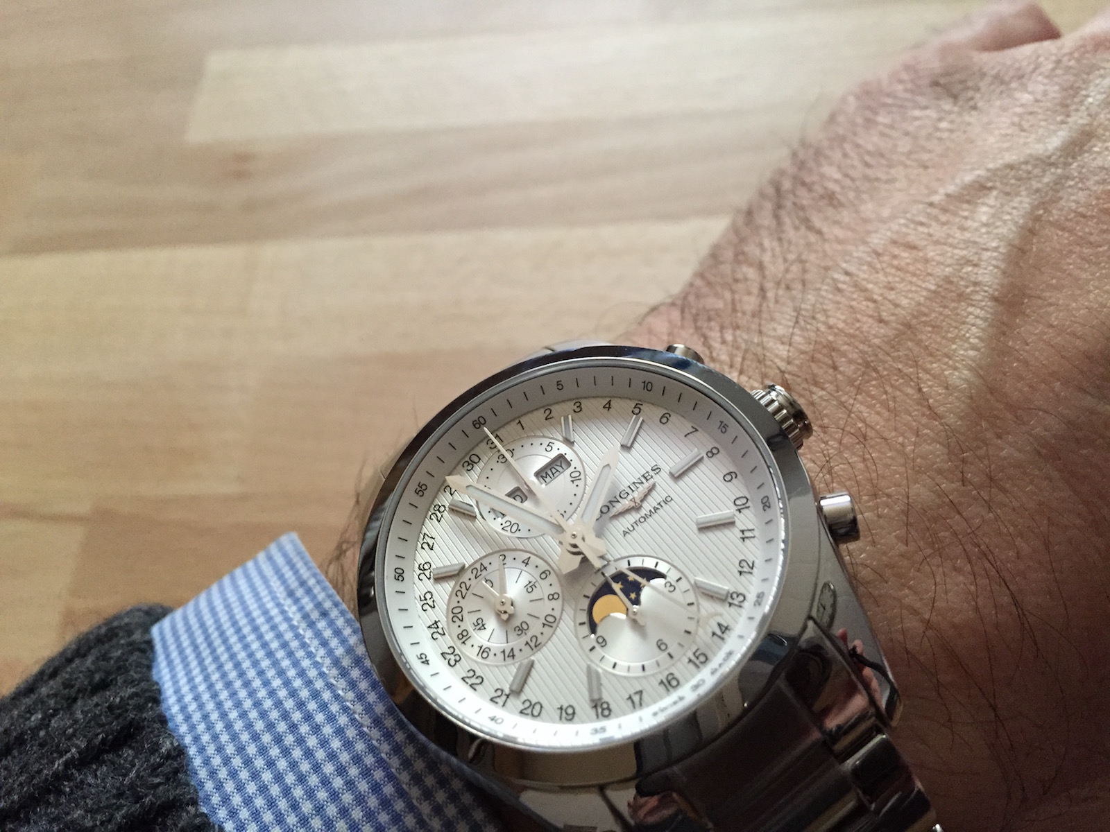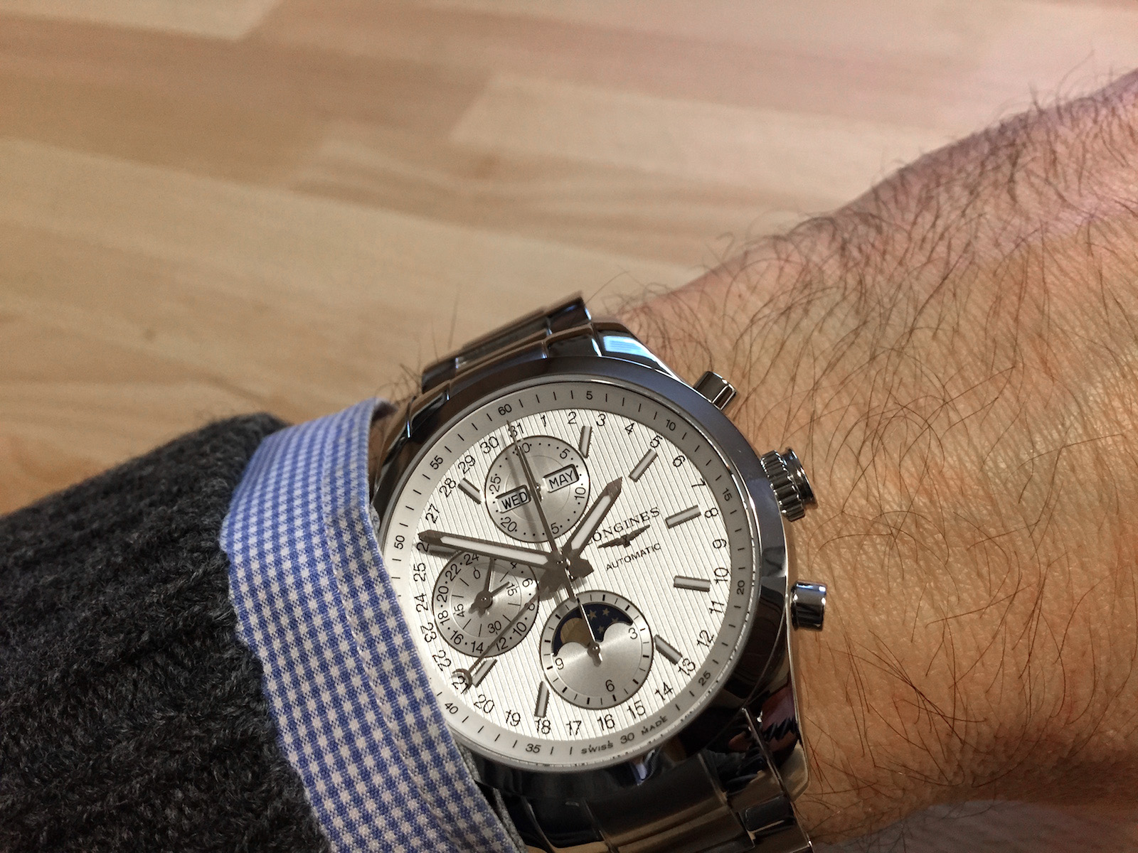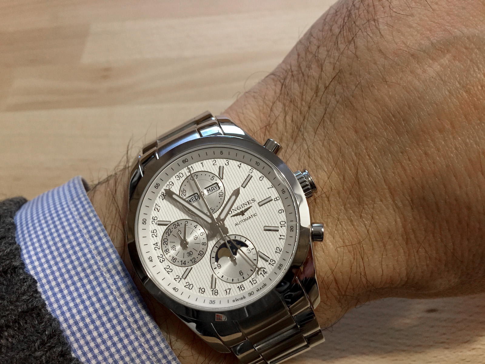En conjunto, y a pesar de la evidente complicación que comporta ofrecer todas estas funciones, Longines ha conseguido diseñar una esfera con un casi perfecto equilibrio, proporcionalidad y legibilidad, unas cualidades que Longines ya ha mostrado en muchas de sus creaciones, como por ejemplo el exquisito Master Collection con cuatro funciones retrógradas, fase lunar y reserva de marcha. El único elemento que no me encaja es la posición de la manecilla del indicador horario de la función cronográfica; en su posición neutra habitual, su aguja tapa parte del cielo del indicador de fase lunar. No es que sea grave, pero personalmente me molesta. Una solución fácil hubiera sido disponer el punto de inicio de la manecilla invertida, o sea, situar las 0 horas donde ahora se encuentran las seis.