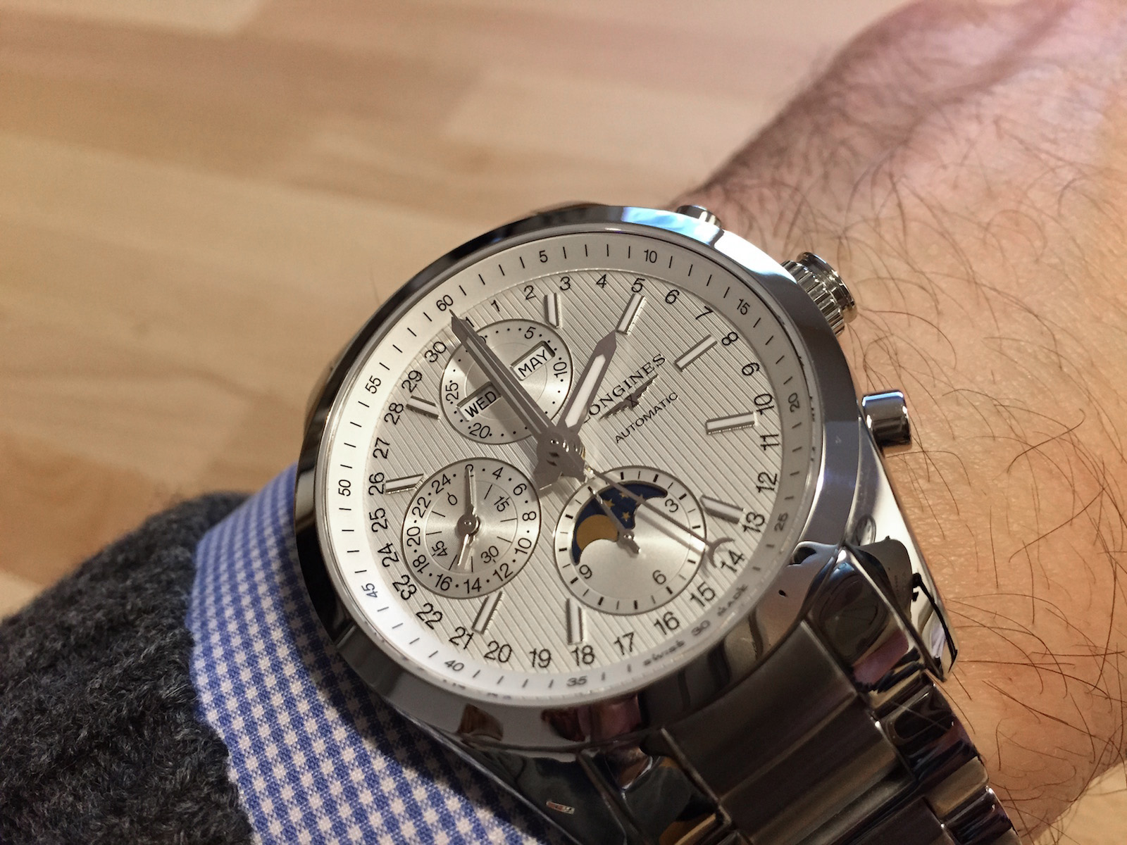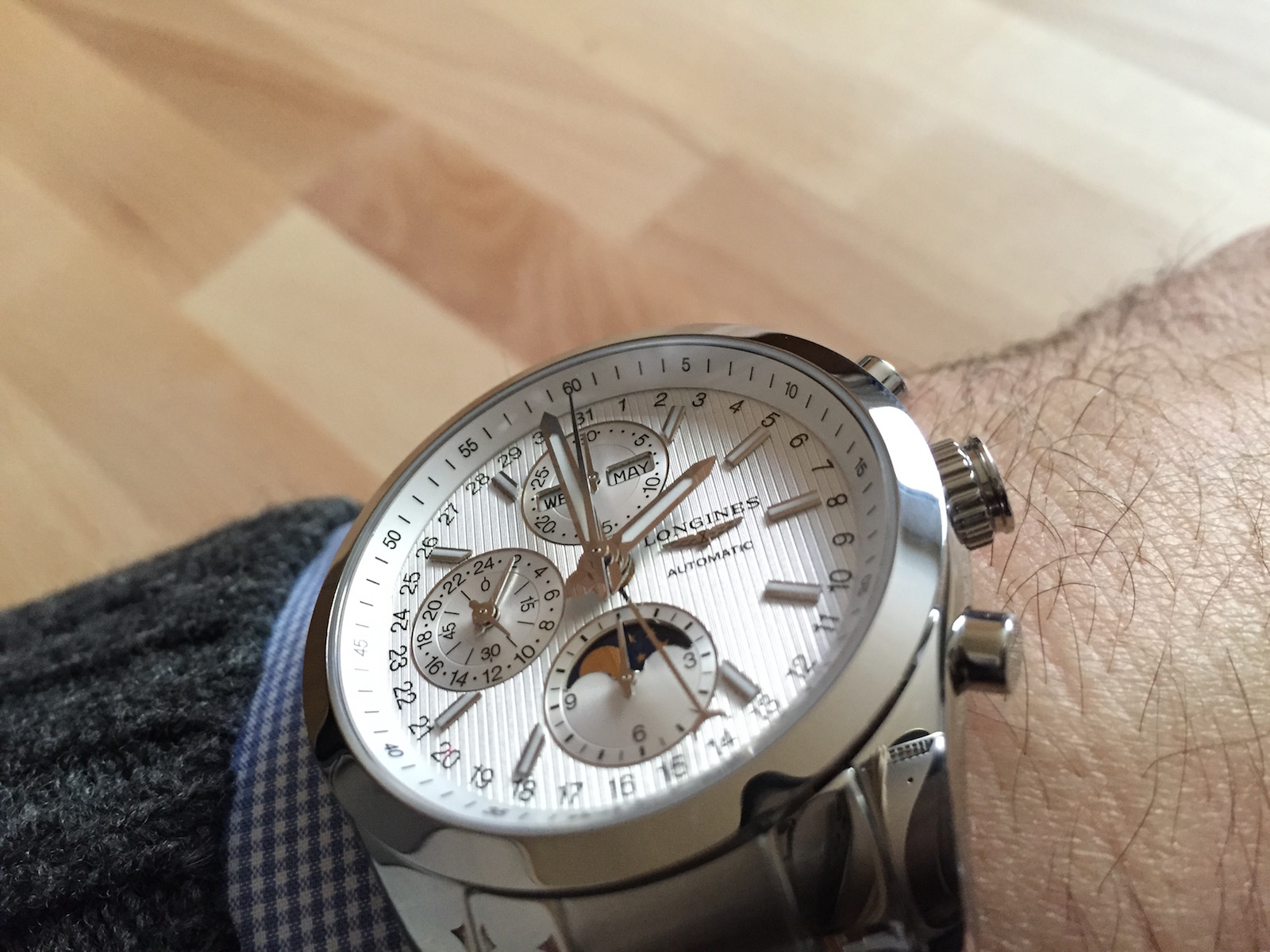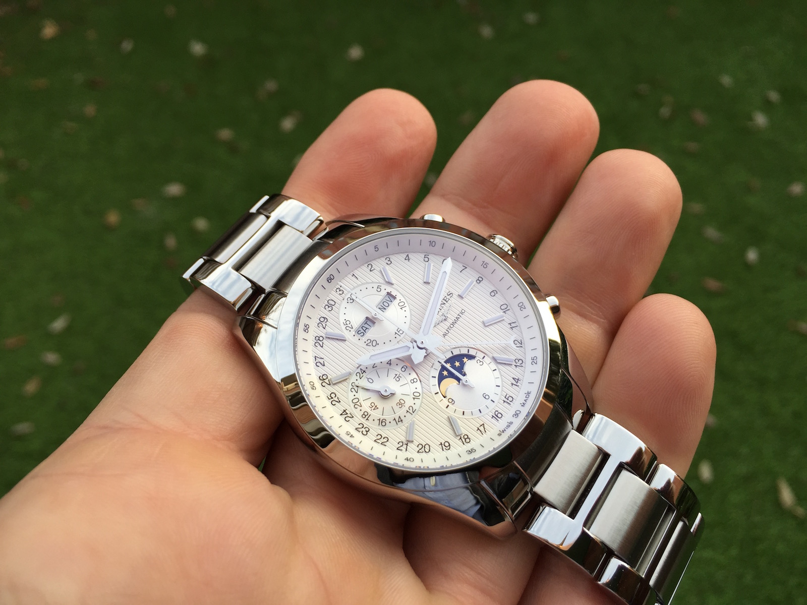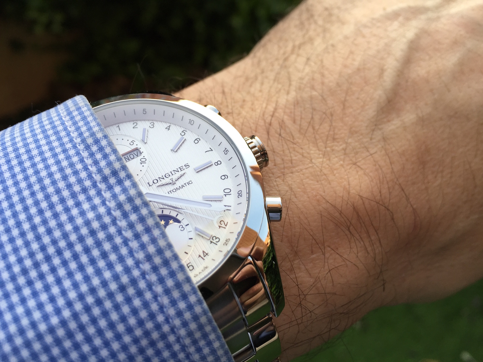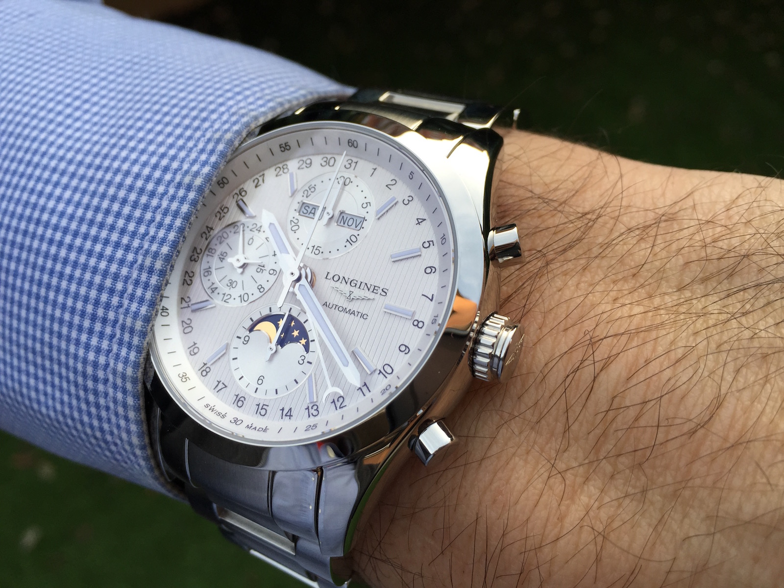 En conjunto, y a pesar de la evidente complicación que comporta ofrecer todas estas funciones, Longines ha conseguido diseñar una esfera con un casi perfecto equilibrio, proporcionalidad y legibilidad, unas cualidades que Longines ya ha mostrado en muchas de sus creaciones, como por ejemplo el exquisito Master Collection con cuatro funciones retrógradas, fase lunar y reserva de marcha. El único elemento que no me encaja es la posición de la manecilla del indicador horario de la función cronográfica; en su posición neutra habitual, su aguja tapa parte del cielo del indicador de fase lunar. No es que sea grave, pero personalmente me molesta. Una solución fácil hubiera sido disponer el punto de inicio de la manecilla invertida, o sea, situar las 0 horas donde ahora se encuentran las seis.