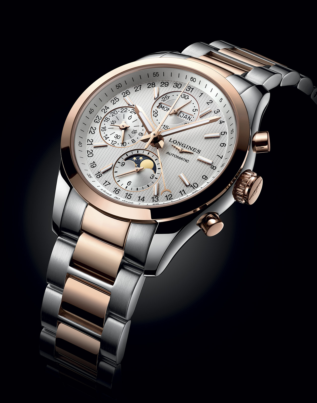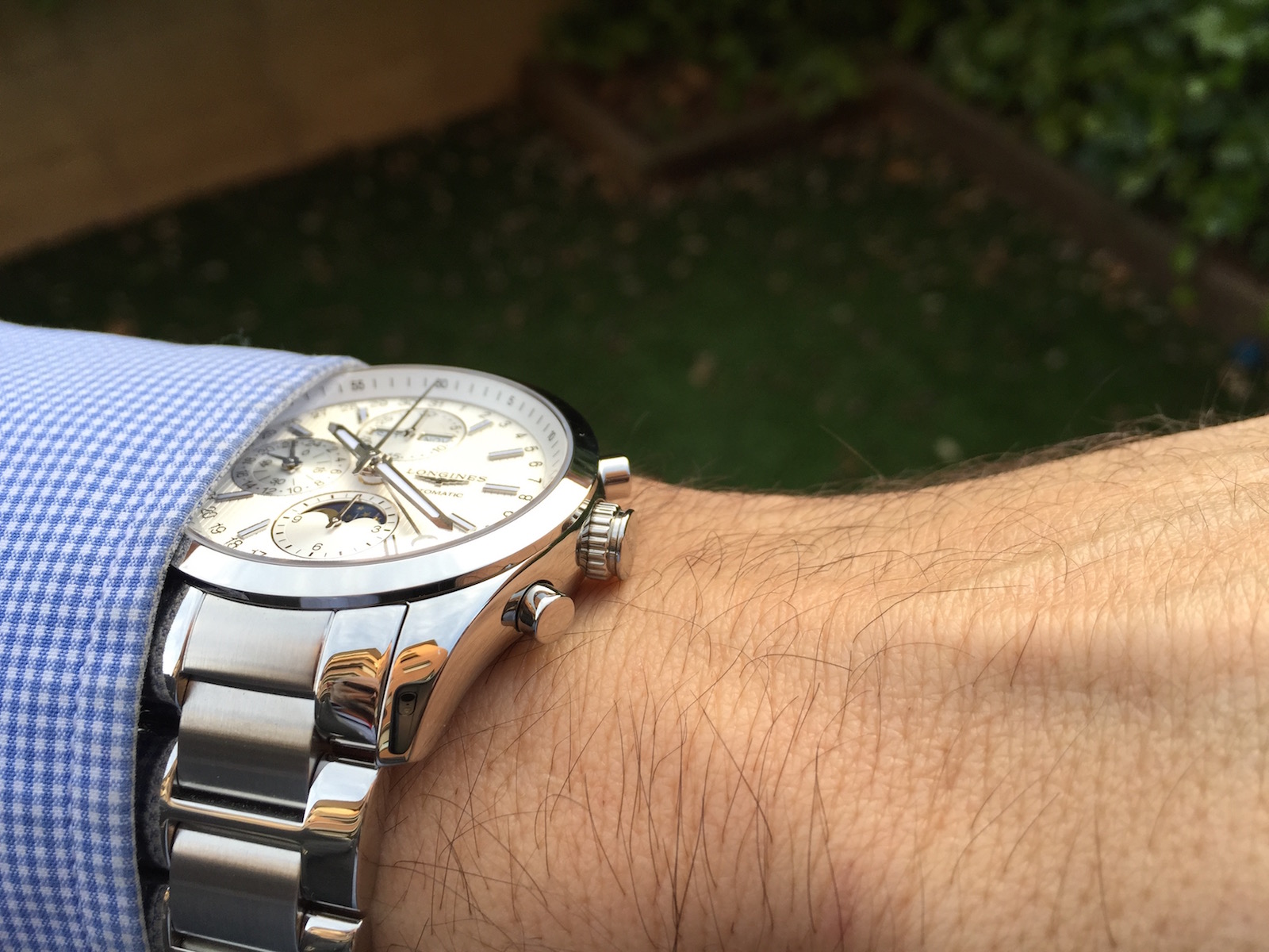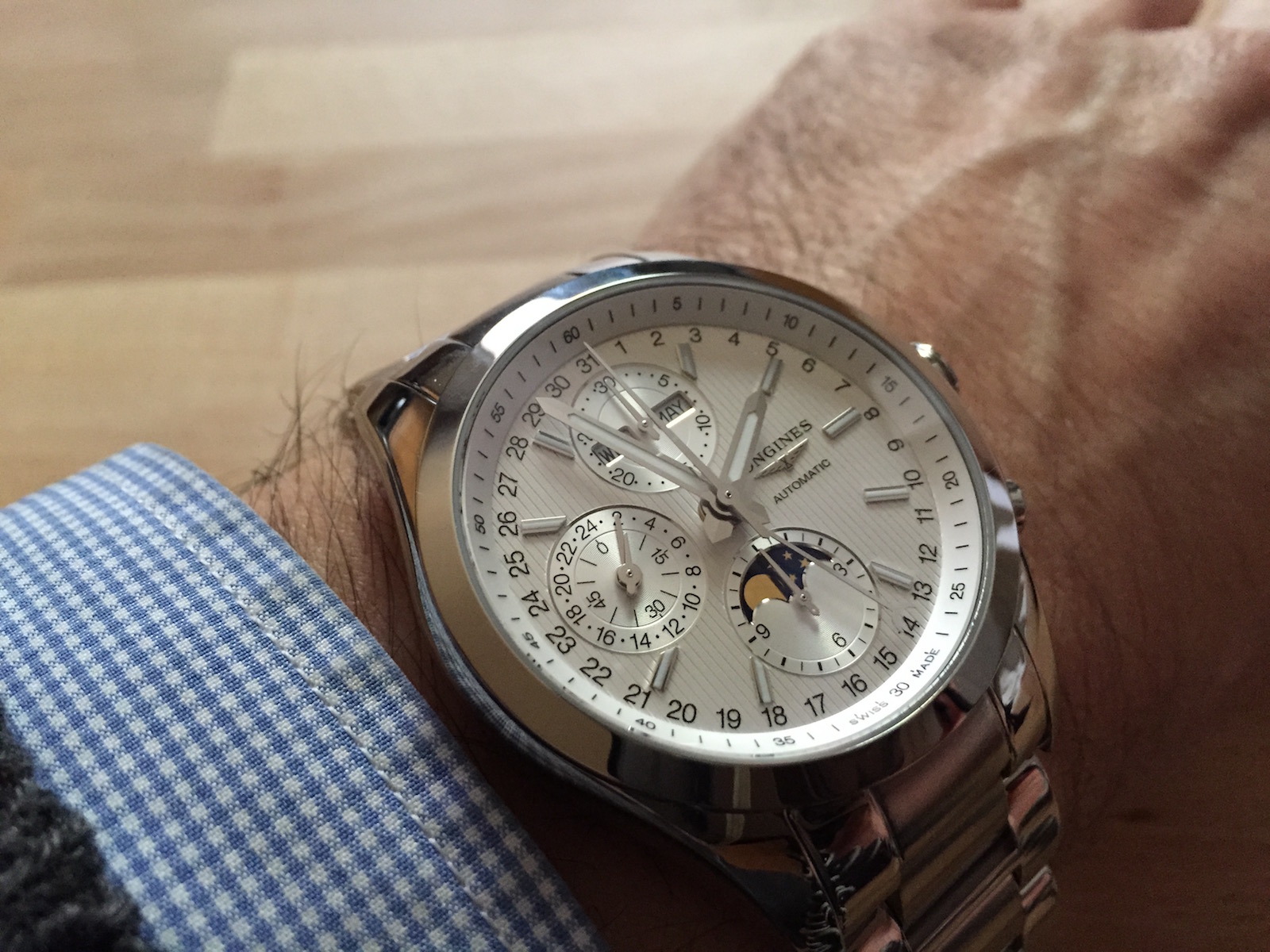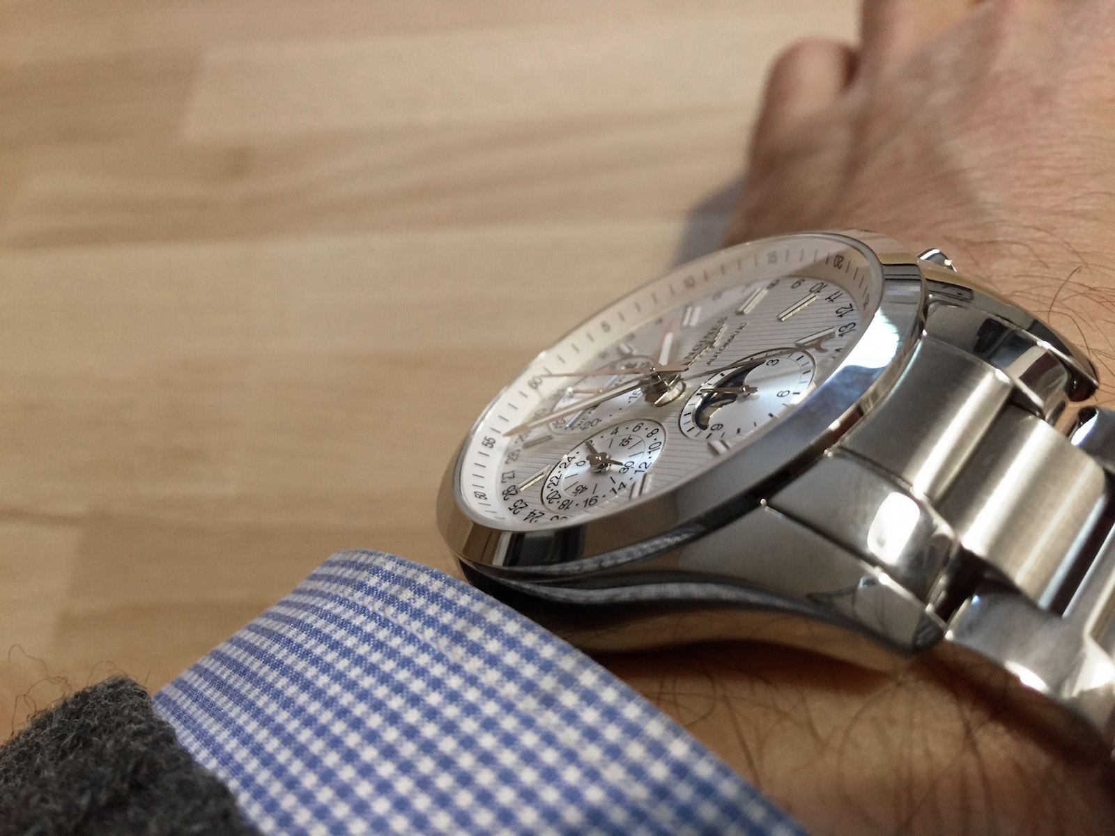 En conjunto, y a pesar de la evidente complicación que comporta ofrecer todas estas funciones, Longines ha conseguido diseñar una esfera con un casi perfecto equilibrio, proporcionalidad y legibilidad, unas cualidades que Longines ya ha mostrado en muchas de sus creaciones, como por ejemplo el exquisito Master Collection con cuatro funciones retrógradas, fase lunar y reserva de marcha. El único elemento que no me encaja es la posición de la manecilla del indicador horario de la función cronográfica; en su posición neutra habitual, su aguja tapa parte del cielo del indicador de fase lunar. No es que sea grave, pero personalmente me molesta. Una solución fácil hubiera sido disponer el punto de inicio de la manecilla invertida, o sea, situar las 0 horas donde ahora se encuentran las seis.