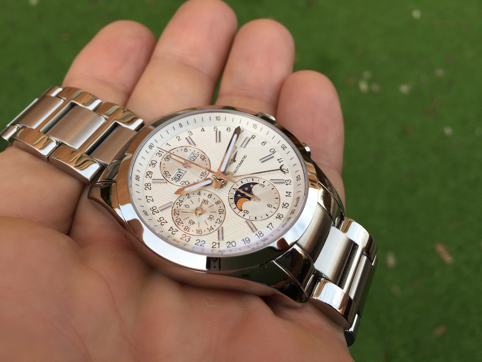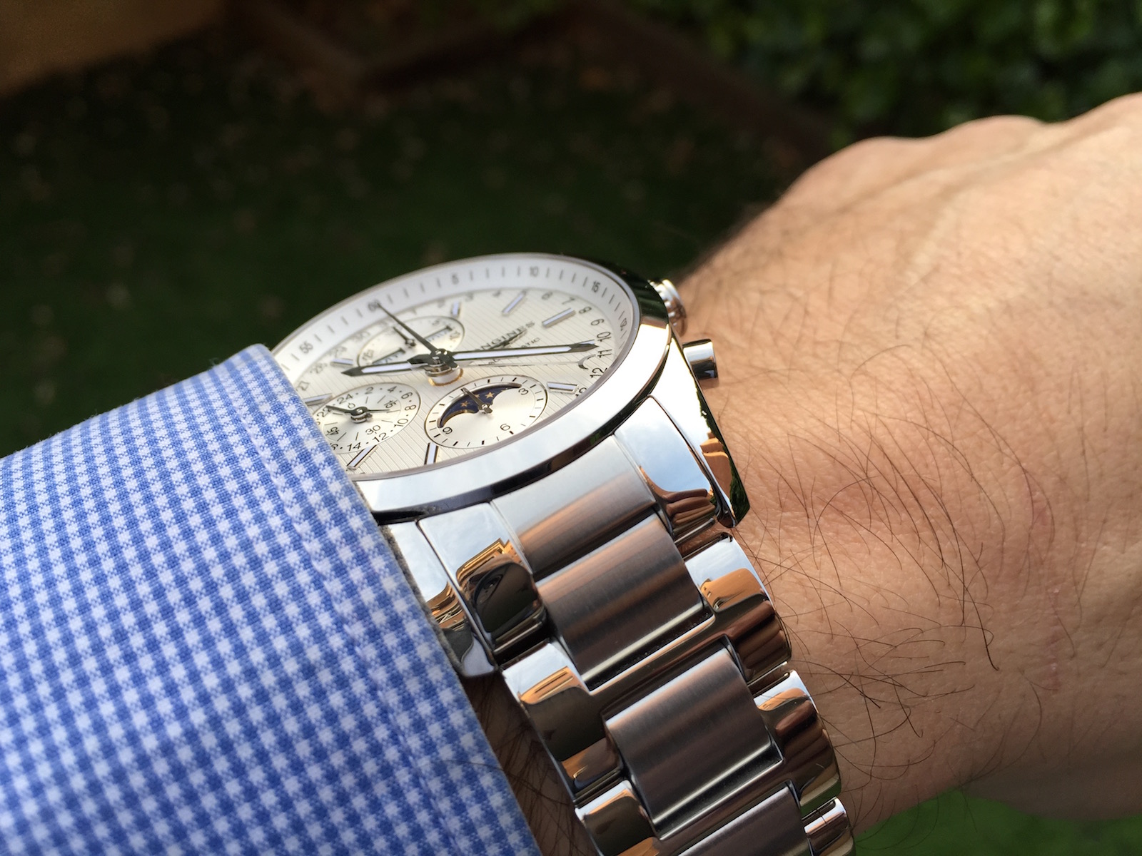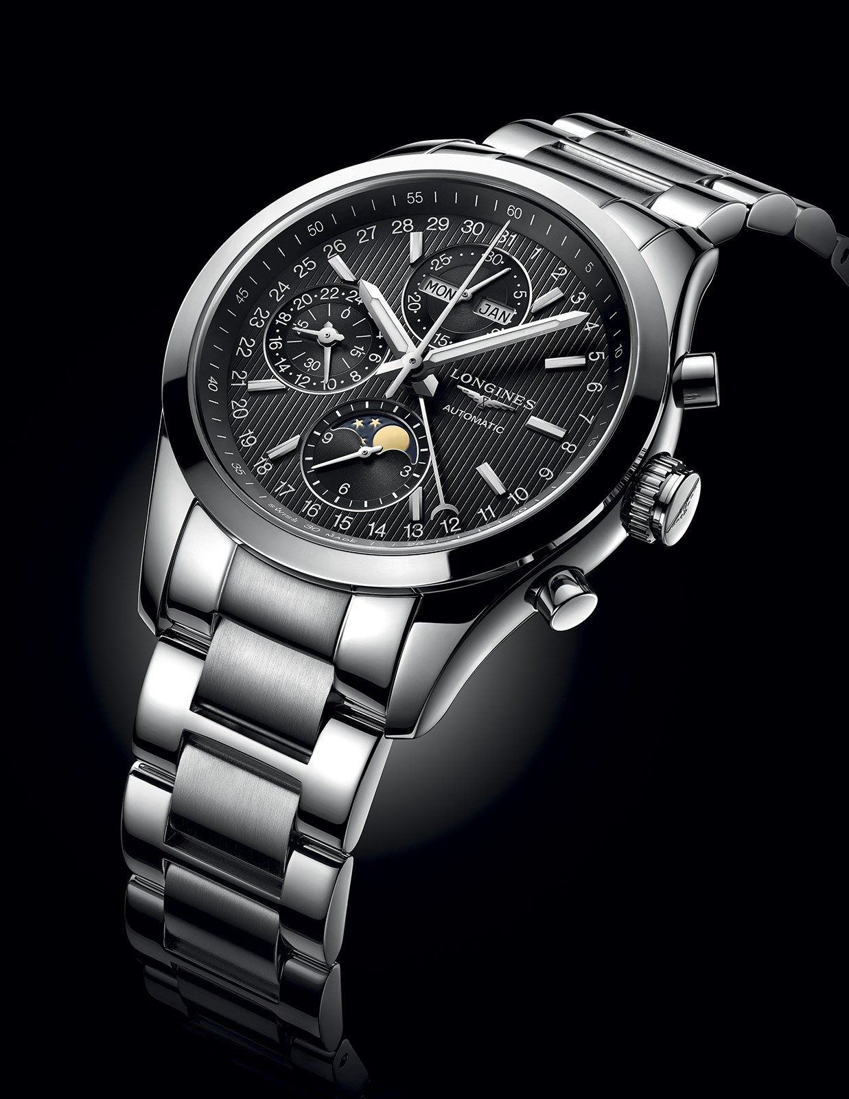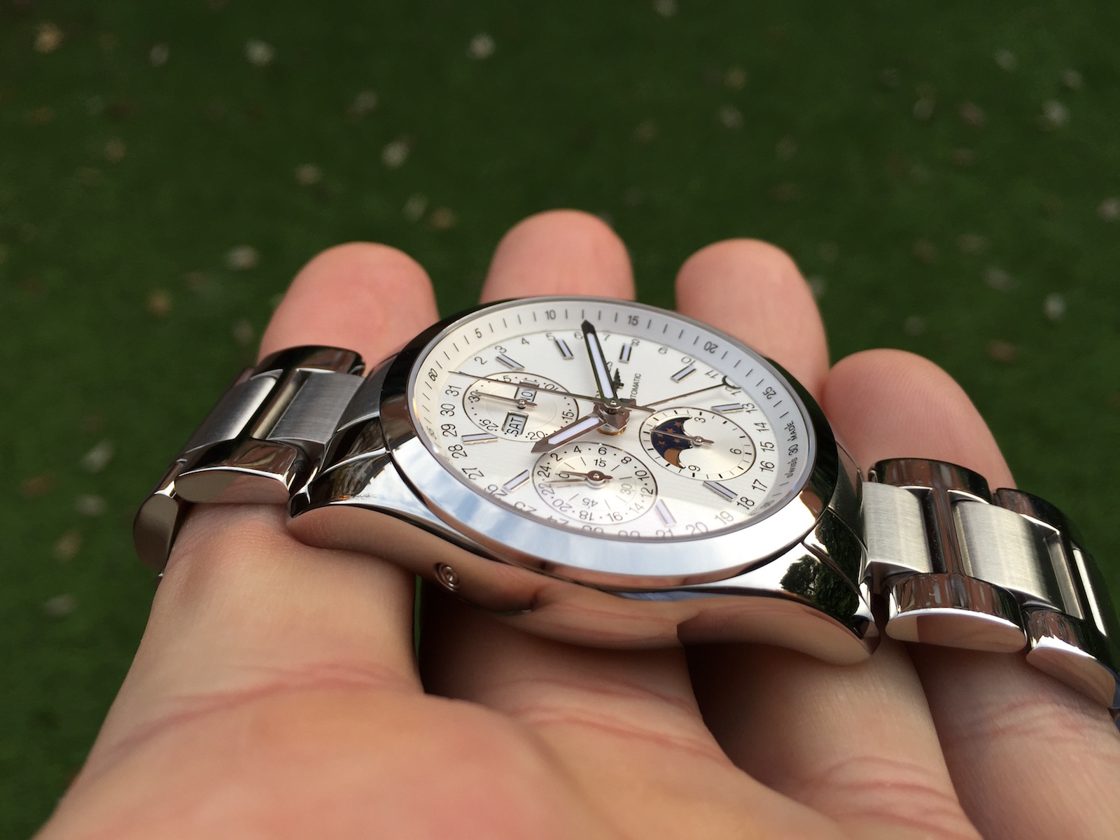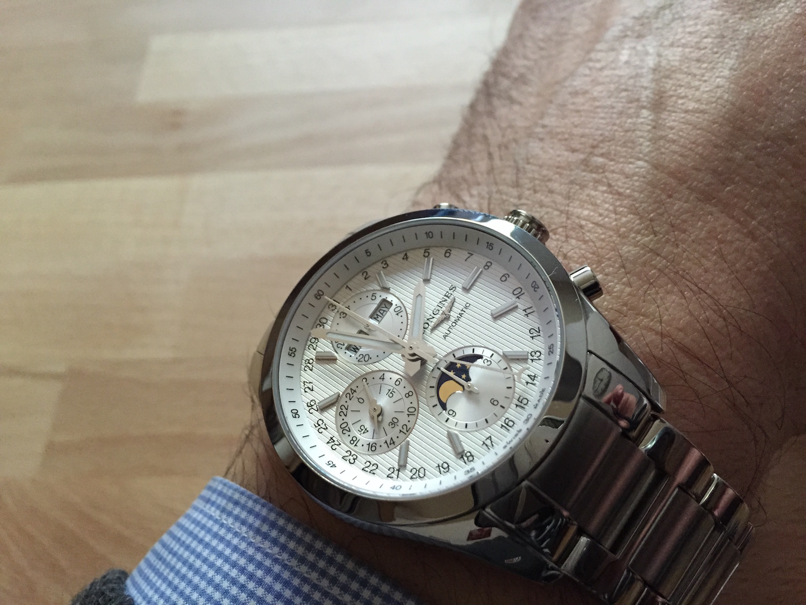 En conjunto, y a pesar de la evidente complicación que comporta ofrecer todas estas funciones, Longines ha conseguido diseñar una esfera con un casi perfecto equilibrio, proporcionalidad y legibilidad, unas cualidades que Longines ya ha mostrado en muchas de sus creaciones, como por ejemplo el exquisito Master Collection con cuatro funciones retrógradas, fase lunar y reserva de marcha. El único elemento que no me encaja es la posición de la manecilla del indicador horario de la función cronográfica; en su posición neutra habitual, su aguja tapa parte del cielo del indicador de fase lunar. No es que sea grave, pero personalmente me molesta. Una solución fácil hubiera sido disponer el punto de inicio de la manecilla invertida, o sea, situar las 0 horas donde ahora se encuentran las seis.
