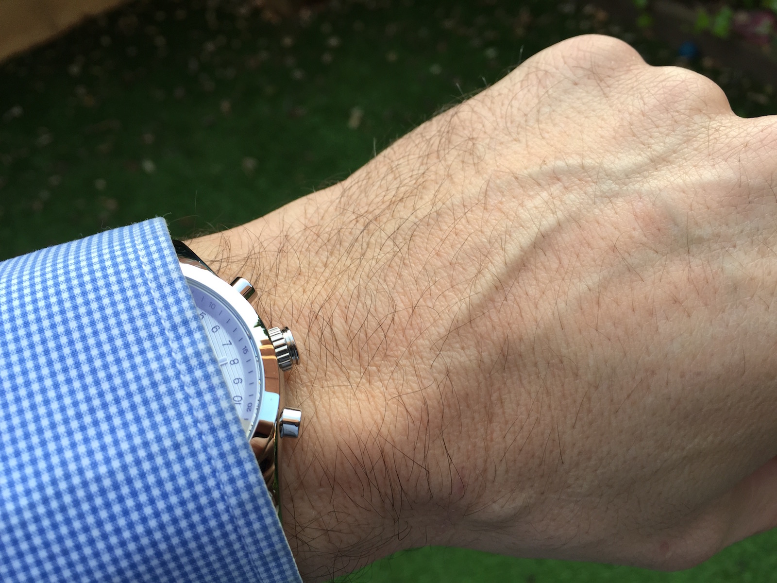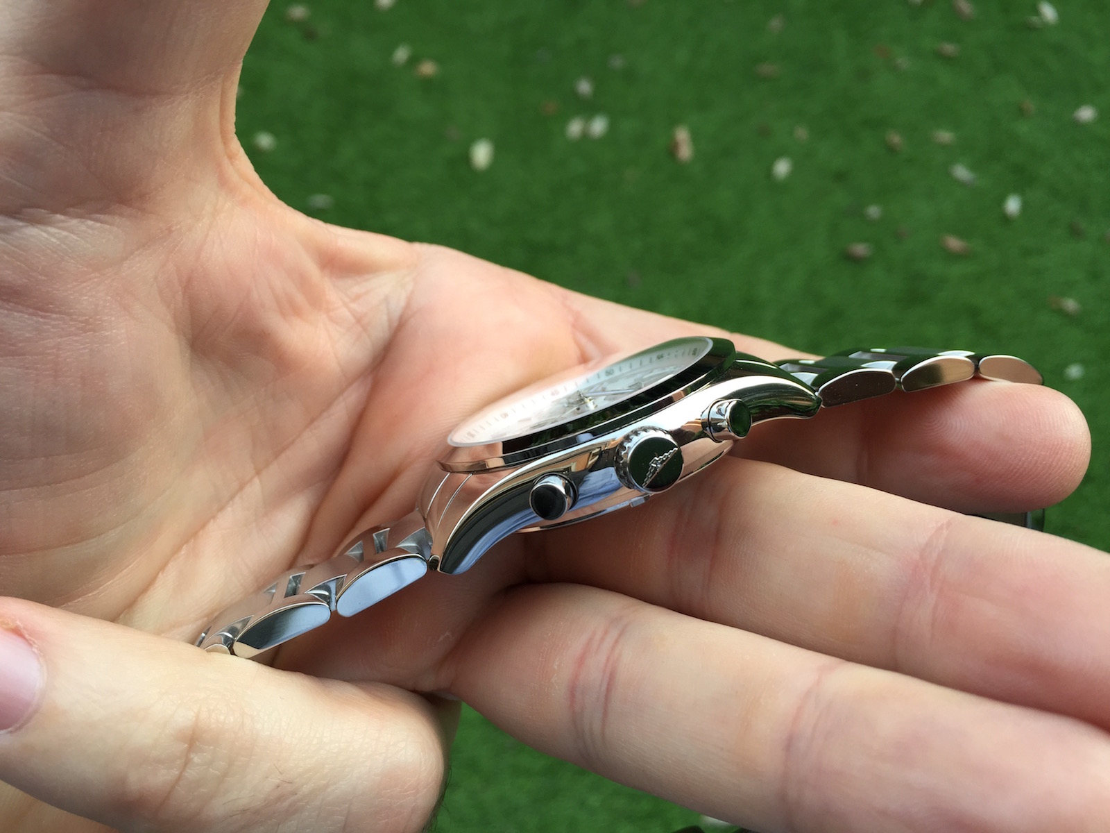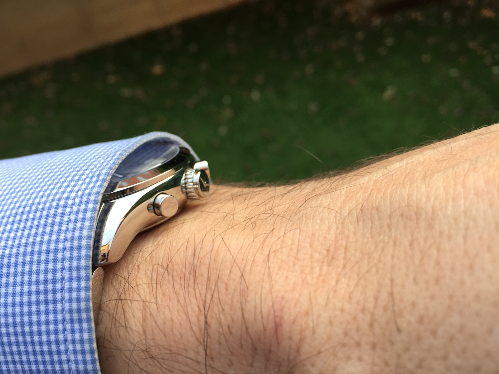 La caja Classic se presenta bajo tres versiones, todas ellas con acabado pulido: acero, oro rosa de 18 quilates, y su combinación bitonal, en que el bisel, la corona y los pulsadores cronográficos son los elementos recubiertos con 200 micras de este noble metal. Después de llevarlo durante medio mes, he de decir que su comodidad ha sido absoluta. A esta excelente ergonomía contribuyen varios factores: