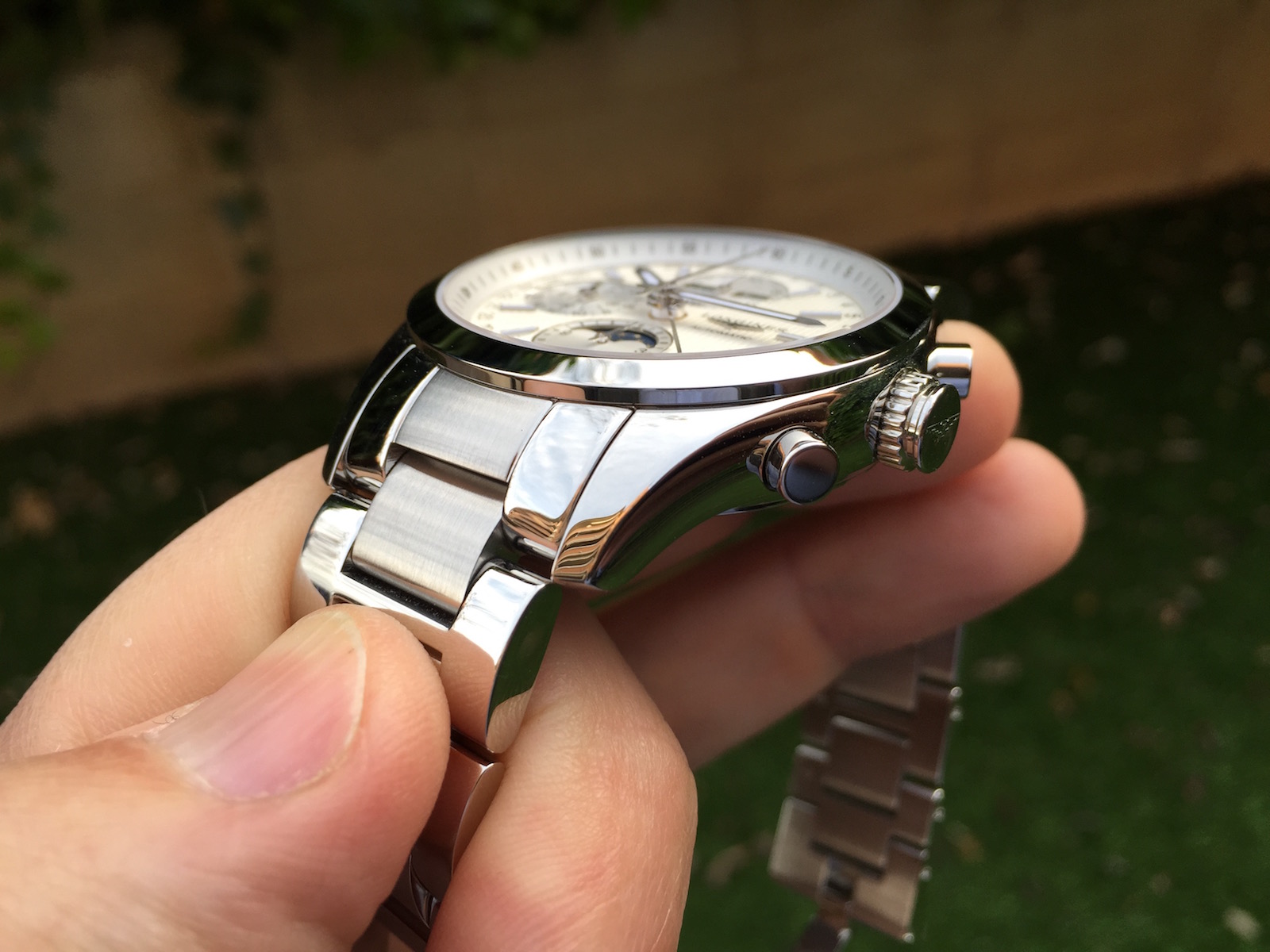 En su carrura derecha se ubican los dos pulsadores cronográficos de geometría cilíndrica a las dos y cuatro horas. A pesar de no ser un cronógrafo con rueda de pilares, su accionamiento no me ha resulta brusco ni excesivamente duro, sino dentro de lo esperado. Entre ambos se encuentra la corona estriada de tres posiciones. En su posición intermedia, si la giramos hacia atrás corregimos la fecha y el mes, lo que deberemos hacer cada mes con menos de 31 días, o sea, cinco veces al año. En cambio, si la giramos hacia adelante, actuaremos sobre la fase lunar. En su posición más externa, podremos sincronizar la función horaria, ayudados por la siempre útil función de parada del segundero. Finalmente, en su carrura izquierda, ubicado a las 10 horas, encontramos el discreto pulsador que controla el día de la semana. Para facilitar esta tarea, Longines entrega un pequeño punzón en acero.