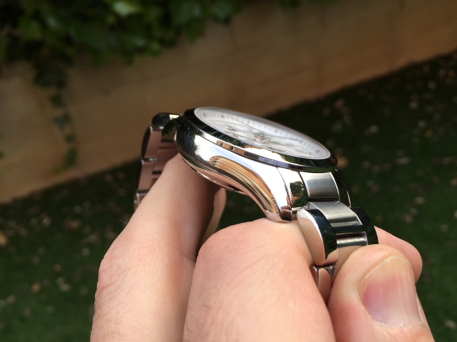 Como ya hemos dicho, su diámetro es de 42 mm, un tamaño de encaje universal en la inmensa mayoría de las muñecas, y que ofrece una amplitud de esfera lo suficientemente generosa como para poder implementar nítidamente todas las indicaciones. Ciertamente, puede resultar una medida levemente excesiva si buscamos un reloj eminentemente de corte elegante, pero que me parece ideal si valoramos su polivalencia atemporal en conjunto con el brazalete metálico. Sus formas son realmente agradables, bastante simples, con una carrura suavemente redondeada que enlaza con fluidez con la curvatura de las asas. En su parte superior, el plano bisel inclinado abarca todo el diámetro de la caja, resiguiendo su misma geometría y enmarcando el cristal de zafiro con tratamiento antirreflejo, el mismo material transparente que implementa el fondo roscado. Su hermeticidad no es uno de sus puntos fuertes, ya que sólo resulta estanco hasta los 5 bares (50 metros). A pesar de ello, no es un aspecto muy a tener en cuenta, ya que, dado su carácter eminentemente clásico y elegante, pocas veces pensaremos en lucirlo en una piscina o en la playa, dos ociosas actividades que podríamos llevar a cabo si elegimos la polivalente opción del brazalete metálico, en cuyo caso sí que me resulta una cifra escasa.