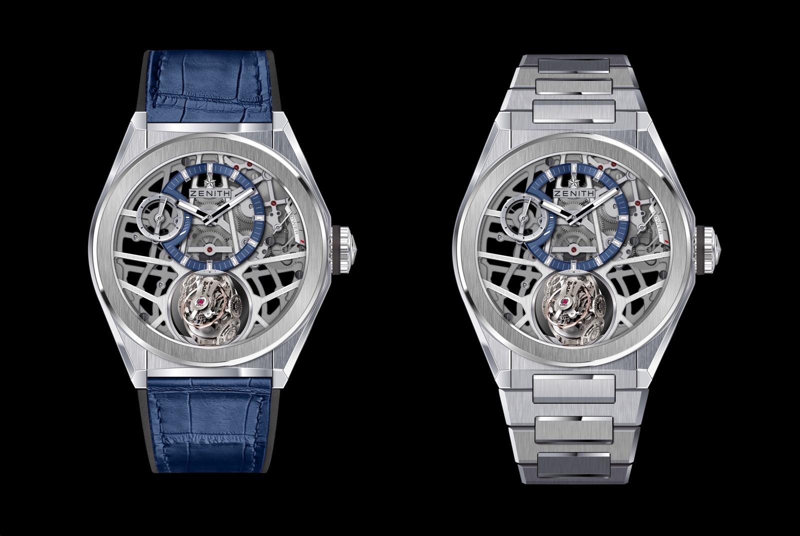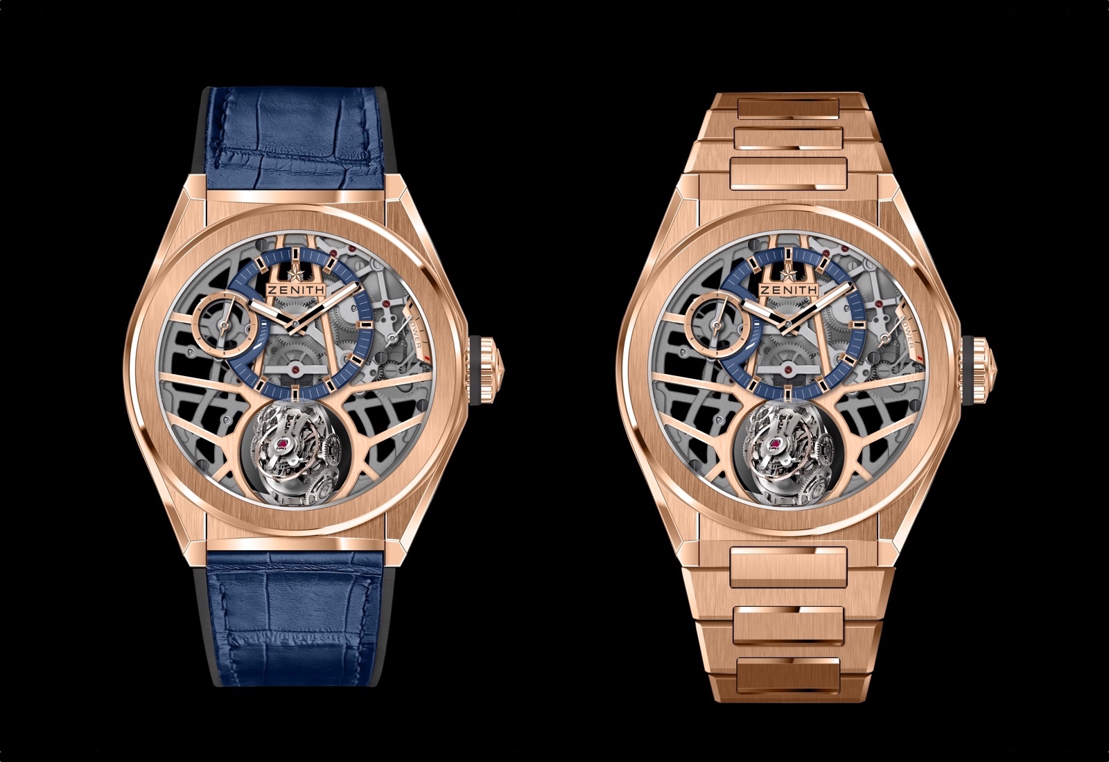 Zenith nos ofrece el Defy Zero G en dos versiones de material de caja; titanio satinado y oro rosa, también con acabado satinado. En ambas variantes se puede elegir entre un brazalete integrado realizado en el mismo metal que la caja o con una correa de piel de aligator.